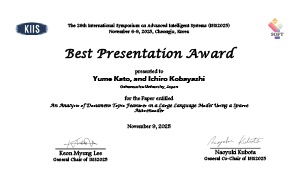 博士前期課程M2の加藤由芽さん、付 宇軒さんがThe 26th International Symposium on Advanced Intelligent Systems(ISIS2025)にてBest Presentation Award受賞