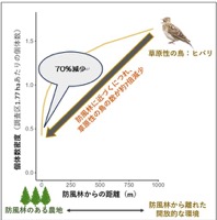 防風林近くの農業湿地では、ヒバリ、ケリなど草原や湿地に棲む野鳥が減少することを確認