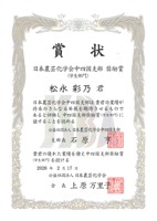 農林海洋科学部4年の松永彩乃さんが、日本農芸化学会中四国支部奨励賞(学生部門)を受賞しました