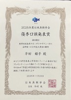 大学院農林海洋科学専攻2年の平田姫子さんが、2025年度日本魚類学会年会において優秀口頭発表賞を受賞しました