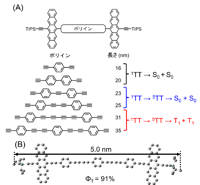 慶應義塾大学理工学部の羽曾部卓教授、酒井隼人専任講師、同大学大学院理工学研究科修士課程(研究当時)の鈴木悠大君、神戸大学ライフ光学イノベーション研究センターの小堀康博教授、婦木正明特命助教、およびタンペレ大学のNikolai V. Tkachenko教授らの国際共同研究グループは、ペンタセンをポリイン(炭素の単結合と三重結合が交互に並んだ分子鎖)で連結した一連の二量体を合成し、最長3.5ナノメートルという極めて長い距離間での「一重項分裂(Singlet Fission: SF)」を観測することに成功しました。これは、これまで報告された一重項分裂の中で最長のスピン伝搬距離に相当します。さ...